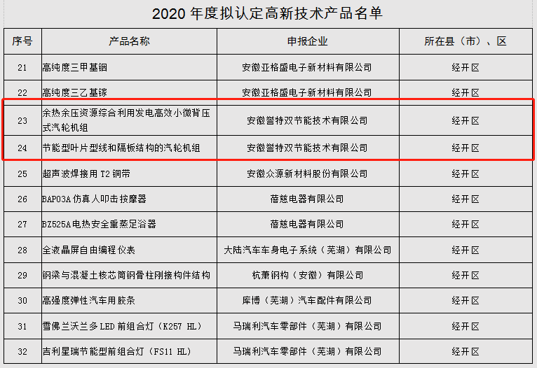 2021年1月11日,安徽省高新技術產品認定名單正式公布。我公司產品“余熱余壓資源綜合利用發電高效小微背壓式汽輪機組、節能型葉片型線和隔板結構的汽輪機組”兩項產品喜獲認定,這次獲得高新技術產品認定再一次驗證了安徽譽特雙的卓越品質,同時也是對我司產品權威的肯定!