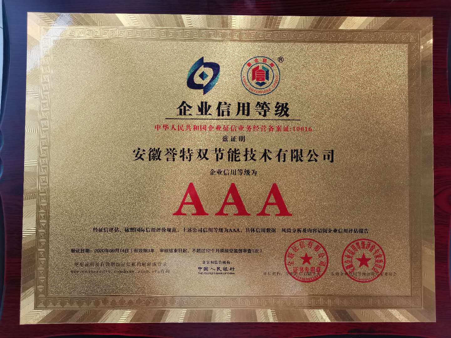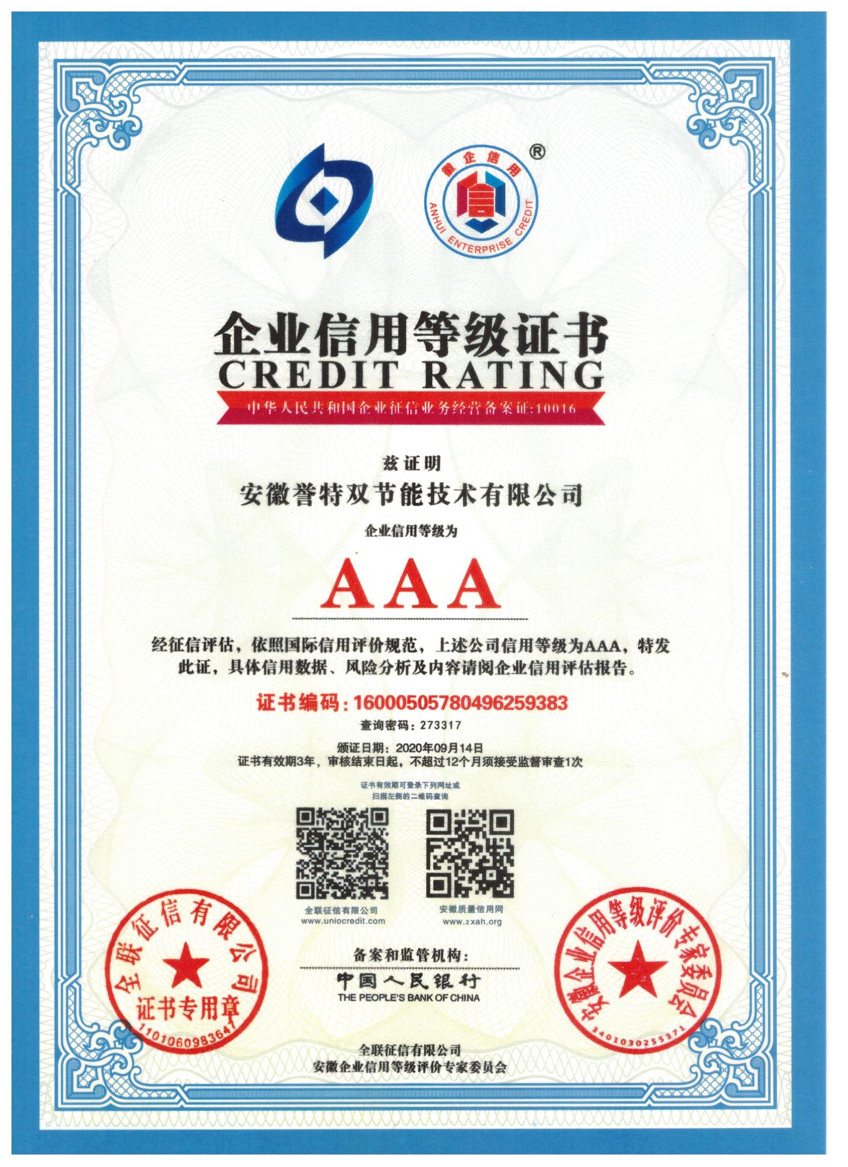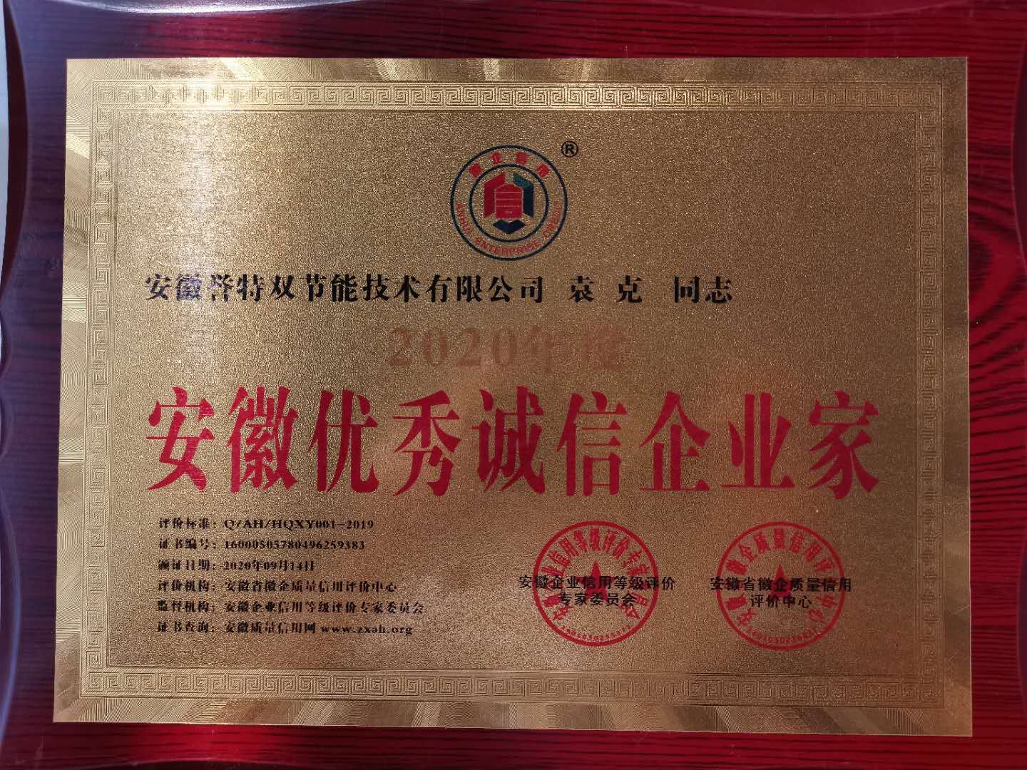 此次公司入選“安徽AAA級信用企業(yè)”,總經(jīng)理袁克同志獲評2020年度“安徽省優(yōu)秀誠信企業(yè)家”,榮譽稱號,即是榮耀,更是鞭策,公司將不斷提高企業(yè)信用建設(shè),發(fā)揮企業(yè)信譽優(yōu)勢,為國家節(jié)能環(huán)保事業(yè)做出更大的貢獻!