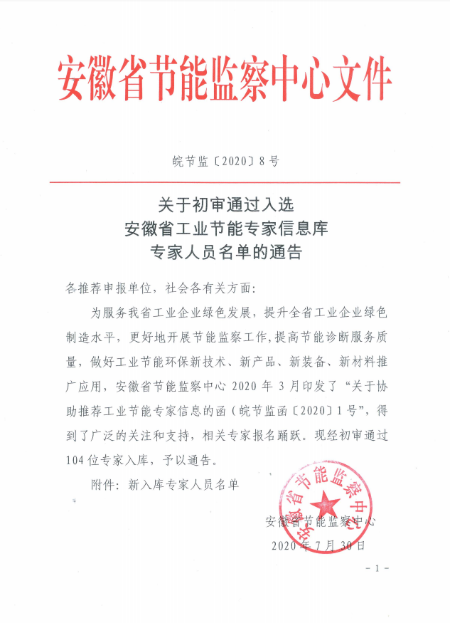 7月30日,安徽省工業節能專家信息庫專家人員名單,經省發改委、省節能監察中心審核、認定,并正式予以公布,我公司總經理袁克、副總經理李清峰等同志喜獲認定。