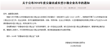 2018年8月29日,安徽省經信委通過官網發布——2018年度安徽省成長型小微企業認定名單,我公司安徽譽特雙節能技術有限公司喜獲認定,為蕪湖市僅有的八家上榜企業之一,也是蕪湖國家級經濟技術開發區和蕪湖高新技術創業園區唯一的入選企業,含金量頗高。