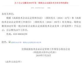 2018年7月24日,國家科技部全國高新技術企業認定管理工作領導小組辦公室,通過科技部火炬中心官網發布——安徽省2018年第一批國家級高新技術企業認定名單的公示通知,我公司安徽譽特雙節能技術有限公司榜上有名,目前已順利通過公示,正式予以認定,公司在此表示熱烈祝賀!