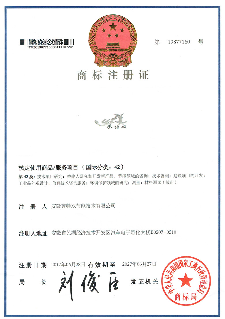 商標(biāo)是知識產(chǎn)權(quán)的重要組成部分,是企業(yè)的無形資產(chǎn),凝聚著生產(chǎn)者、經(jīng)營者的智慧和勞動,體現(xiàn)著企業(yè)的經(jīng)營成果。我公司申請的“譽特雙”商標(biāo)的成功注冊,不僅使該標(biāo)志能夠得到國家強(qiáng)制力的保護(hù),而且對豐富企業(yè)品牌,維護(hù)企業(yè)名稱,擴(kuò)大企業(yè)影響,都將具有積極的意義;標(biāo)志著譽特雙在品牌建設(shè)方面取得了一個里程碑的勝利,勝利得之不易,我們會通過全體員工的不懈努力來維護(hù)譽特雙節(jié)能公司的信譽,不斷提高客戶對我們品牌的認(rèn)可度,從而使商標(biāo)的價值不斷提升,為企業(yè)客戶提供更優(yōu)質(zhì)的節(jié)能服務(wù)。