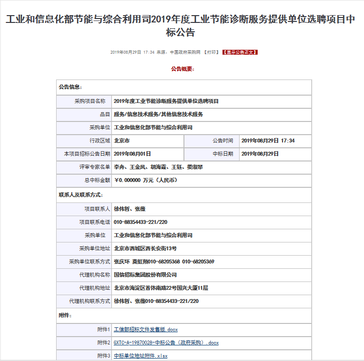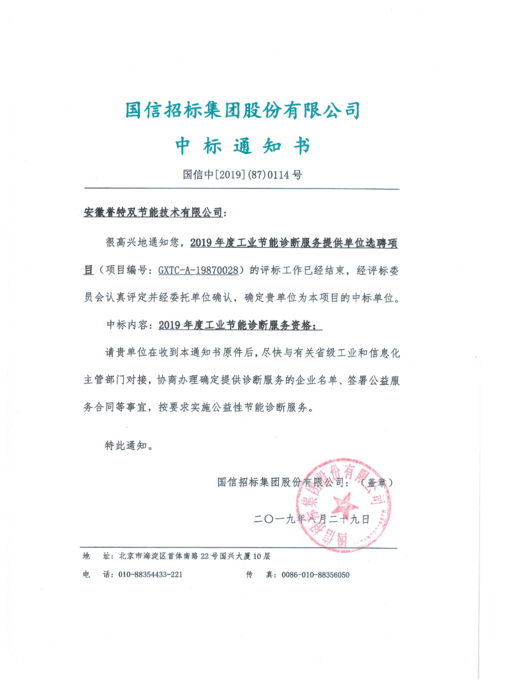 2019年8月30日,公司成功入選工業和信息化部節能與綜合利用司“2019年度工業節能診斷服務提供單位選聘項目”。(http://www.ccgp.gov.cn/cggg/zygg/zbgg/201908/t20190829_12790036.htm)