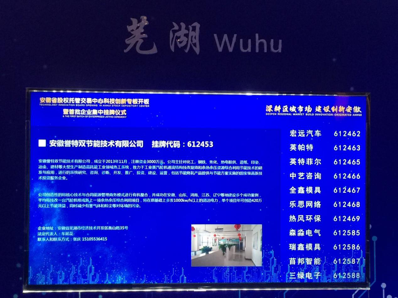 4月24日上午,安徽省股權托管交易中心科技創新專板開板暨首批企業集中掛牌儀式在合肥市隆重舉行,全省首批掛牌企業787家,譽特雙公司榮耀成為首批掛牌企業之一,股票代碼:612453。