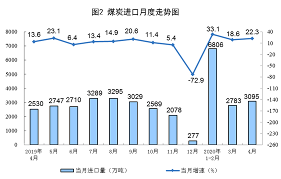 原煤生產增長較快。4月份,生產原煤3.2億噸,同比增長6.0%,增速比上月回落3.6個百分點;日均產量1074萬噸,環比減少14萬噸。1—4月份,生產原煤11.5億噸,同比增長1.3%。
