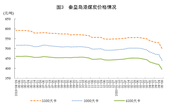 煤炭進口增長較快,交易價格有所下跌。4月份,進口煤炭3095萬噸,同比增長22.3%;1—4月份,進口煤炭1.3億噸,同比增長26.9%。港口煤炭綜合交易價格繼續下跌,5月8日秦皇島港5500、5000和4500大卡煤炭價格分別為每噸501元、442元和396元,比4月3日分別下跌39元、41元和36元。