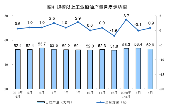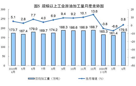 原油生產平穩,加工量由降轉增。4月份,生產原油1587萬噸,同比增長0.9%,增速由負轉正,上月為下降0.1%,日均產量52.9萬噸;加工原油5385萬噸,同比增長0.8%,上月為下降6.6%,日均加工179.5萬噸。1—4月份,生產原油6444萬噸,同比增長2.0%;加工原油20348萬噸,同比下降3.4%。