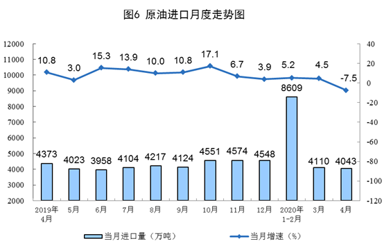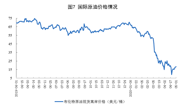 原油進口下降,國際原油價格低位震蕩。4月份,進口原油4043萬噸,同比下降7.5%。1—4月份,進口原油16761萬噸,同比增長1.7%。4月30日布倫特原油現貨離岸價格為18.11美元/桶,比3月31日的14.85美元/桶上漲22.0%。