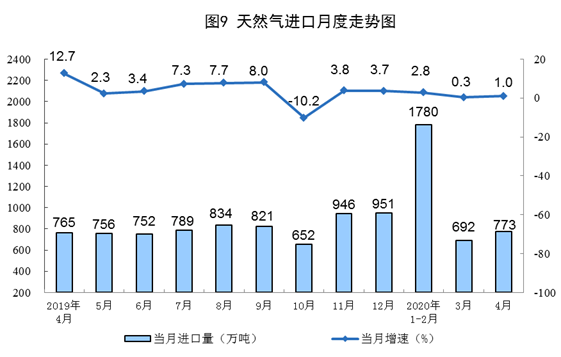 天然氣進口小幅增長。4月份,進口天然氣773萬噸,同比增長1.0%。1—4月份,進口天然氣3233萬噸,同比增長1.5%。