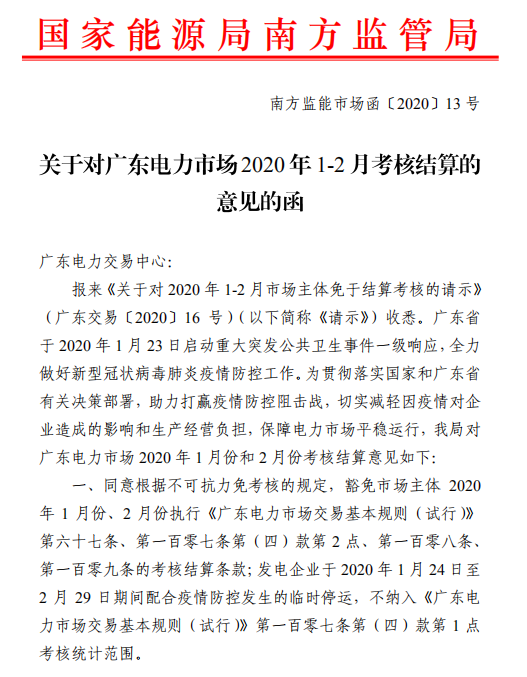 廣東電力市場(chǎng)2020年1-2月考核結(jié)算:取消售電公司、電力用戶(hù)、發(fā)電企業(yè)的部分考核結(jié)算條款