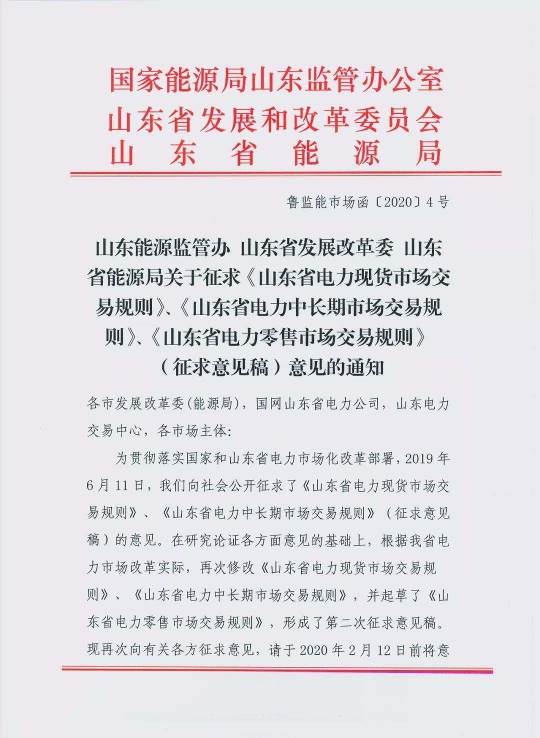 北極星售電網訊:北極星售電網獲悉,國家能源局山東能監辦、山東省發改委、山東省能源局日前發布了關于征求《山東省電力現貨市場交易規則》、《山東省電力中長期市場交易規則》、《山東省電力零售市場交易規則》(征求意見稿)意見的通知。山東為貫徹落實國家和山東電力市場化改革部署,2019年6月11日,山東省向社會公開征求了《山東省電力現貨市場交易規則》、《山東省電力中長期市場交易規則》(征求意見稿)的意見。在研究論證各方面意見的基礎上,根據山東省電力市場改革實際,再次修改《山東省電力現貨市場交易規則》、《山東省電力中長期市場交易規則》,并起草了《山東省電力零售市場交易規則》,形成了第二次征求意見稿。現再次向有關各方征求意見,并請求社會各界于2020年2月12日前將意見反饋。