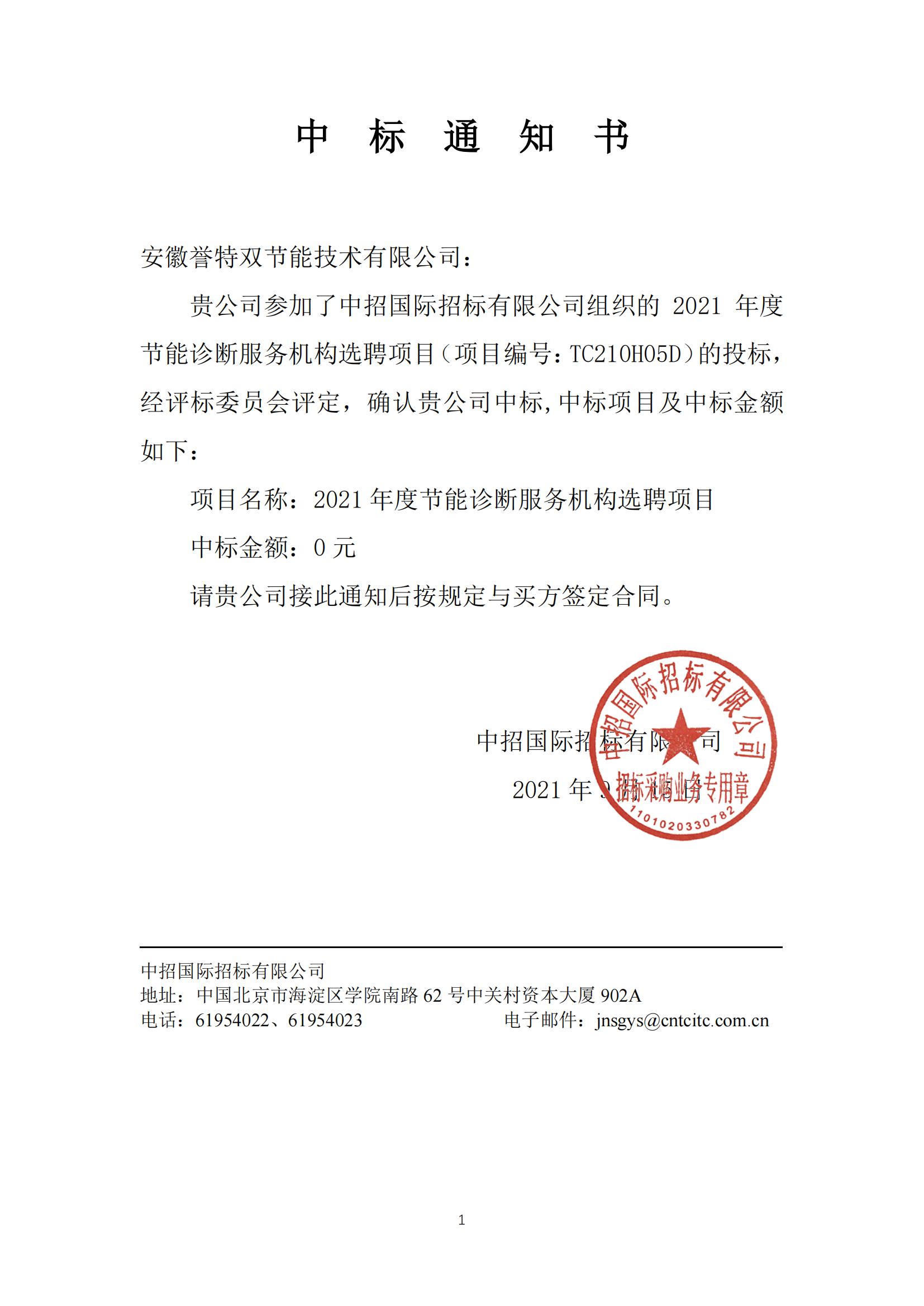 2021年國家工業節能診斷中標通知書
