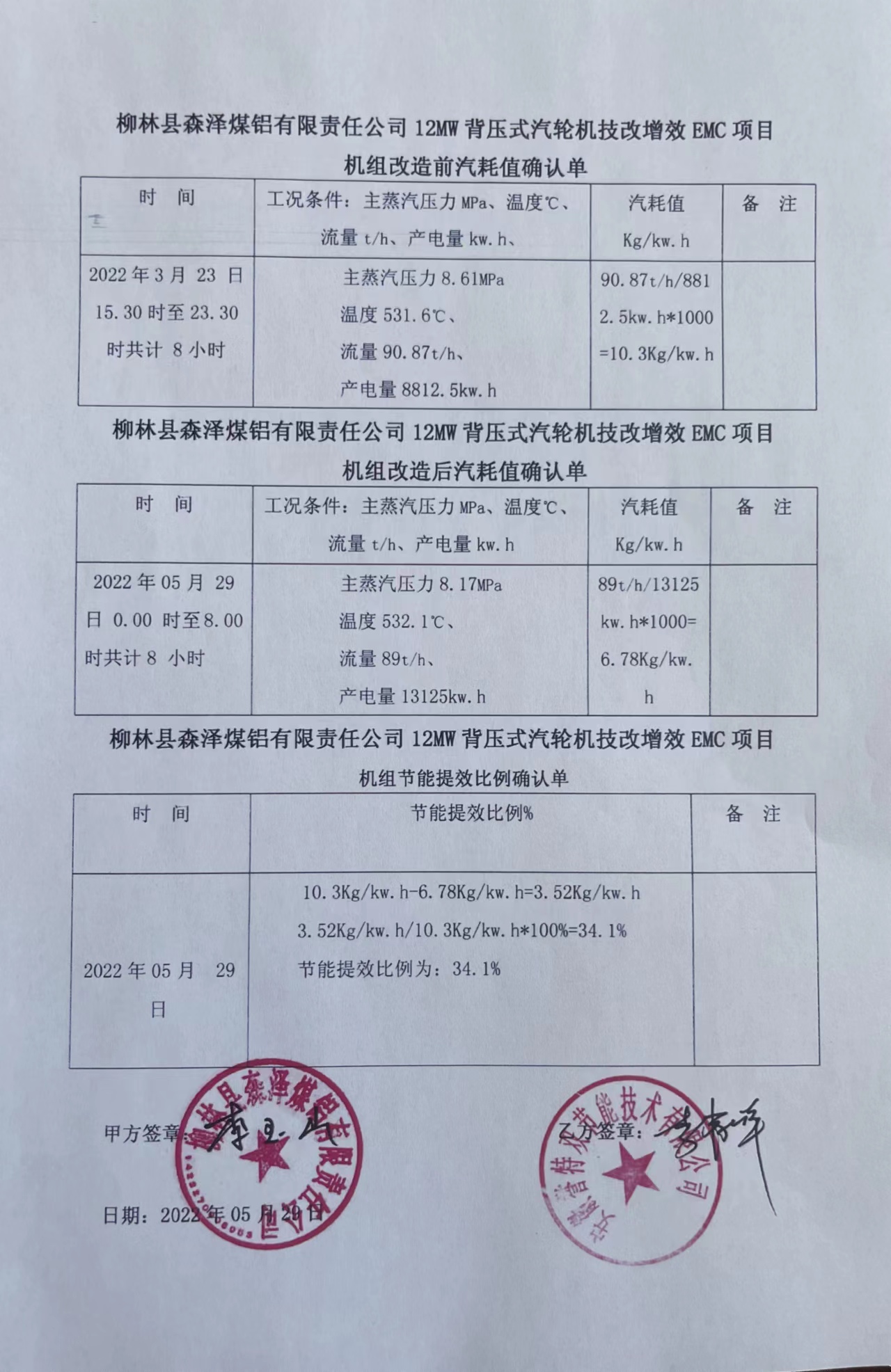 我公司以合同能源管理模式,全額投資實施的山西森澤煤鋁集團12MW背壓1#機組節能技改提效合同能源管理項目,自2022年5月19日開機沖轉成功并網以來,機組各項參數指標均正常、穩定。項目于5月29日順利通過工程驗收,實測同等工況條件下,節能提效比例達34.1%,遠超合同約定的30.7%考核指標。