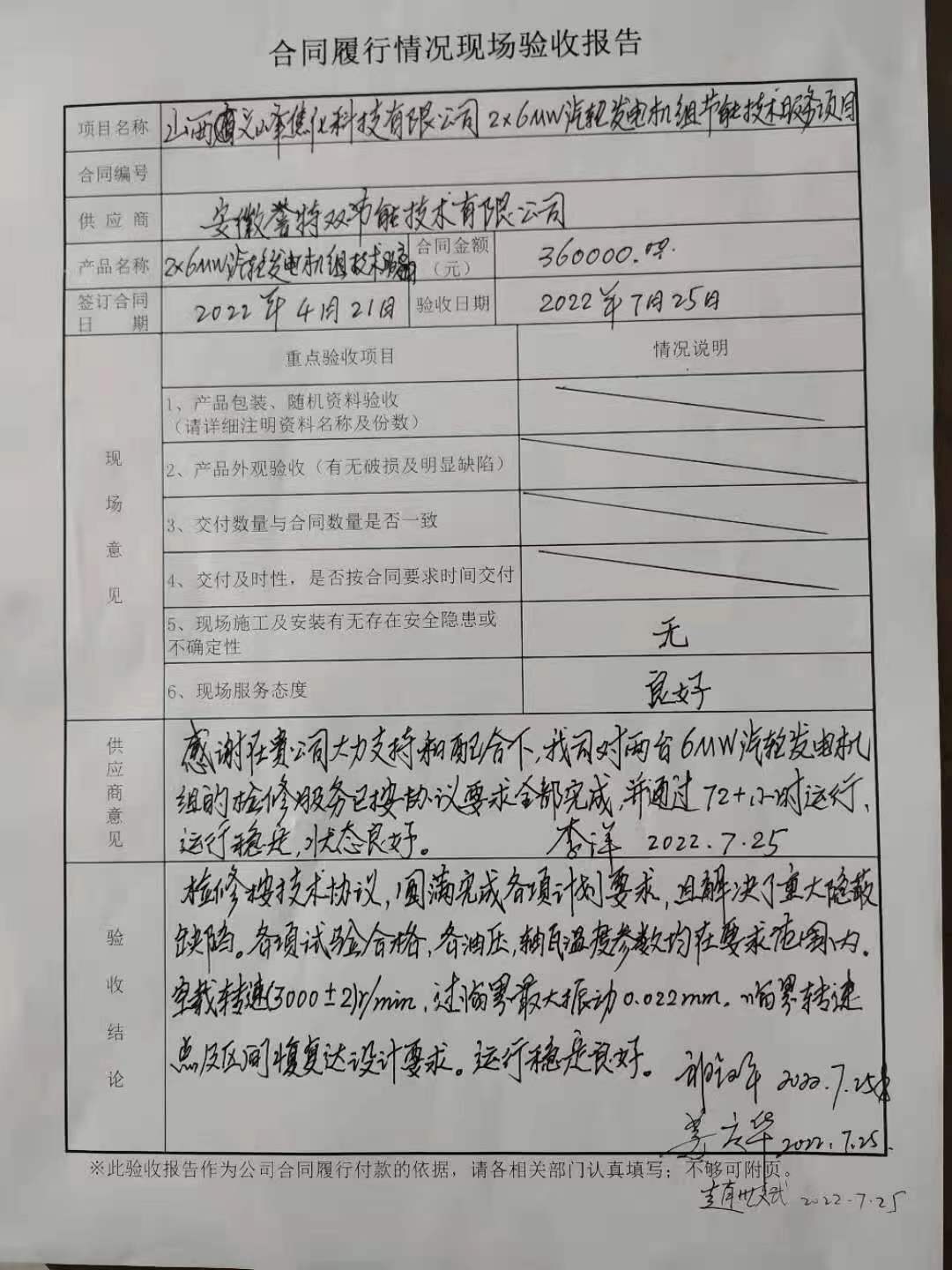 近日,我安徽譽特雙節能技術有限公司,承接的山西文峰焦化科技有限公司2X6MW汽輪機組檢修技術服務項目,兩臺機組均按合同與技術協議的有關約定,完成項目施工,并順利通過工程驗收。
