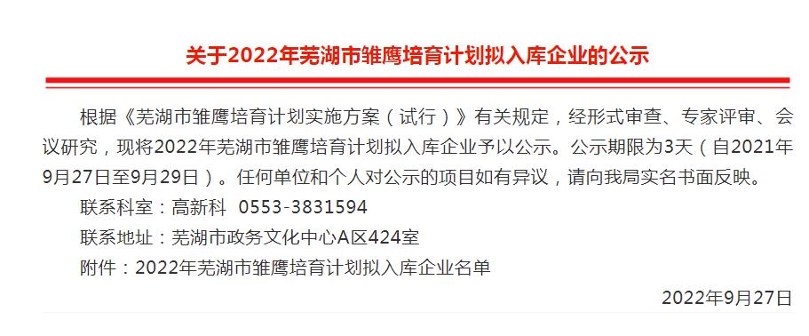 近日,經(jīng)市科技局統(tǒng)一組織申報(bào)、形式審查、專家評(píng)審、會(huì)議研究通過,公布2022年度蕪湖市雛鷹培育計(jì)劃入庫(kù)名單,我公司喜獲認(rèn)定。