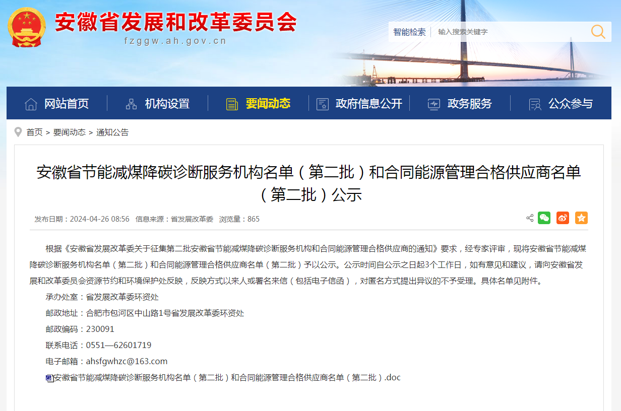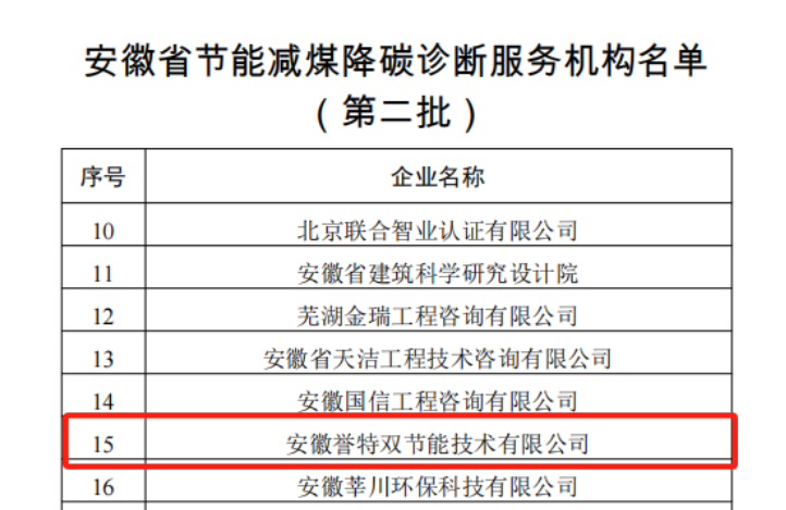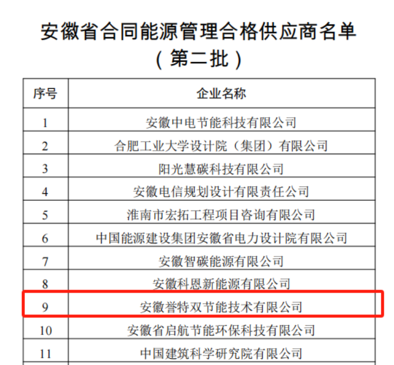 近日,安徽省發改委發布第二批安徽省節能減煤降碳診斷服務機構和合同能源管理合格供應商名單,本次節能減煤降碳診斷服務機構共計擇優評選出29家企業,合同能源管理合格供應商共計擇優評選出14家企業,我公司雙雙榮列榜單,在此表示熱烈祝賀。
