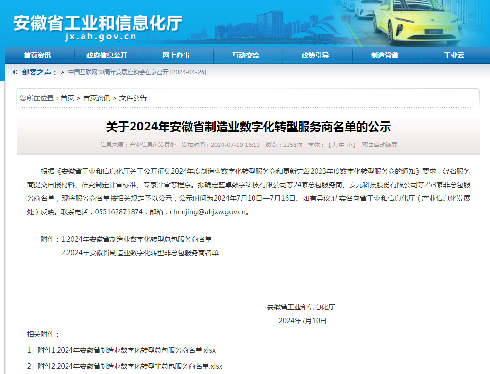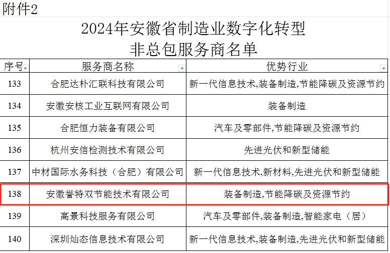 近日,根據(jù)《安徽省工業(yè)和信息化廳關(guān)于公開征集2024年度制造業(yè)數(shù)字化轉(zhuǎn)型服務(wù)商和更新完善2023年度數(shù)字化轉(zhuǎn)型服務(wù)商的通知》要求,經(jīng)各服務(wù)商提交申報(bào)材料、研究制定評(píng)審標(biāo)準(zhǔn)、專家評(píng)審等程序,由安徽省工業(yè)和信息化廳發(fā)布2024年安徽省制造業(yè)數(shù)字化轉(zhuǎn)型服務(wù)商名單,我公司名列其中,在此表示熱烈祝賀!
